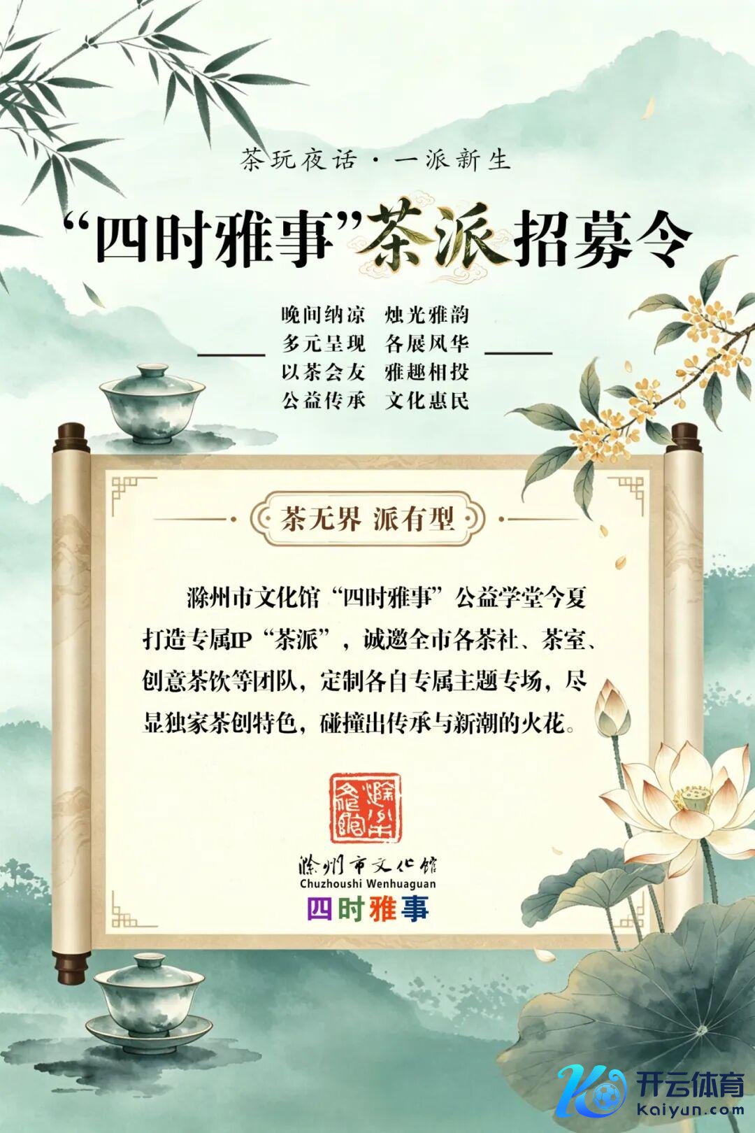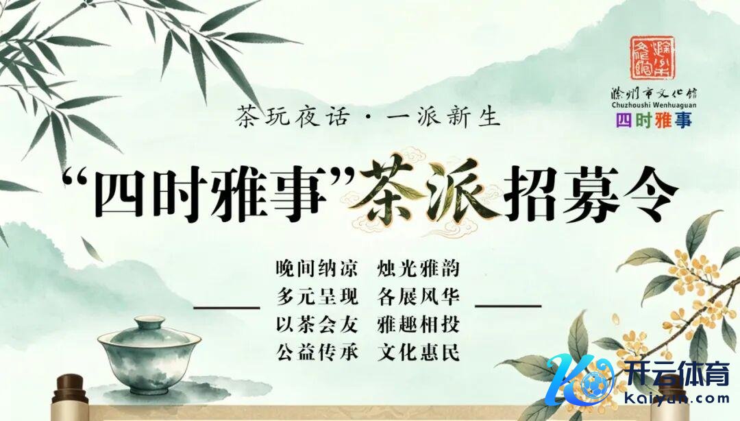 在这里,千年茶韵遇上了年青立场,时间传承碰撞出新潮抒发,滁州市文化馆“四时雅事”公益学堂,今夏为滁州茶文化量身打造专属IP——“茶派”,诚邀全市各茶社、茶馆、创意茶饮等团队,独处打造各自团队的专属主题专场,尽显茶创特点,共赴文化盛宴。