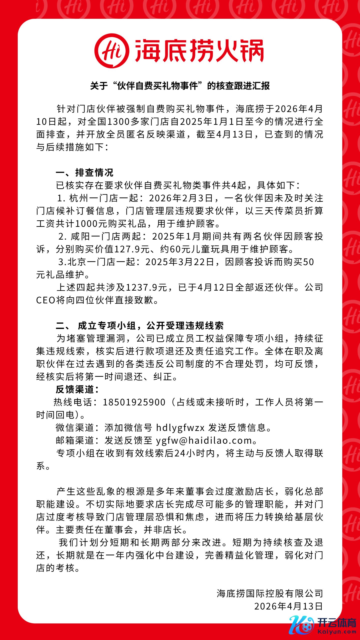 海底捞回复“强制职工私费买礼物”:已核实雷共事件4起 公司CEO将向四位伙伴平直致歉海底捞回复“强制职工私费买礼物”:已核实雷共事件4起 公司CEO将向四位伙伴平直致歉